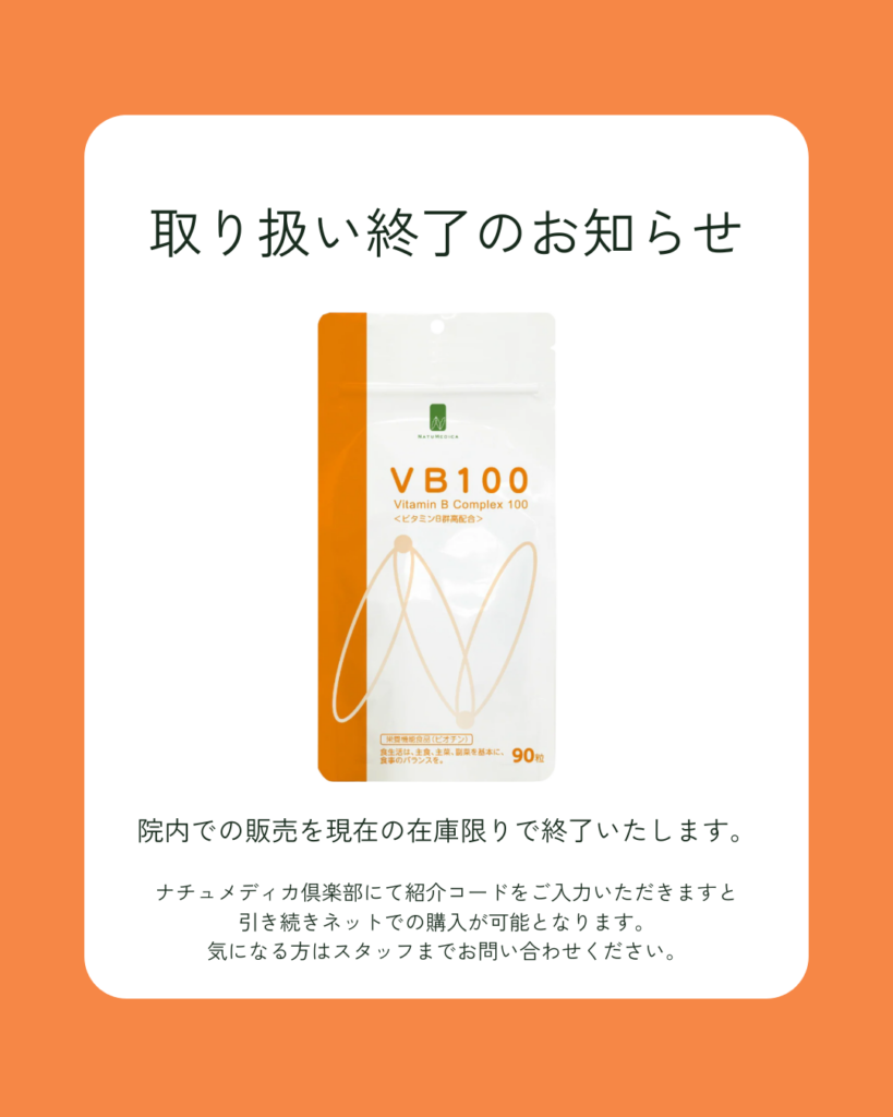 誠に勝手ながら現在の在庫限りでVB100サプリメントの取り扱いを終了とさせていただきます。
